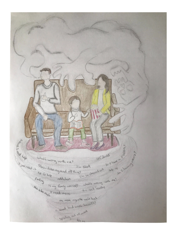 Martin, a 16-year-old from South Fork High School, created a striking art piece focused on the dangers of secondhand smoke. Using charcoal and colored pencils, he illustrates how smoke creeps into everyday spaces, affecting even those who don’t choose to smoke. His powerful imagery includes words spiraling through the smoke, emphasizing how these toxic messages silently reach others—particularly families. The visual effect makes the hidden dangers of secondhand smoke impossible to ignore, offering a thoughtful and impactful interpretation of the issue.
