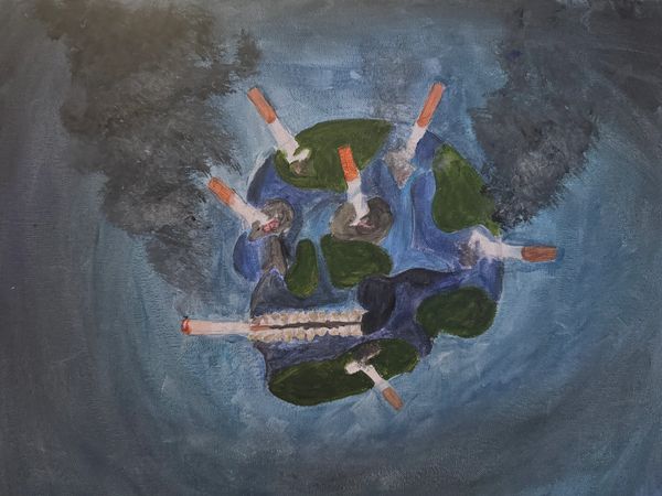 Raevyn, a 17-year-old student from South Fork High School in Humboldt County, created a powerful acrylic painting that addresses the environmental impact of tobacco use. Drawing from her observation of cigarette litter in everyday places, she transforms the Earth into an ashtray, visually overwhelmed by smoke and pollution. The imagery evokes a sense of global suffocation, cleverly illustrating how tobacco use extends its harm far beyond individual health to the planet itself.