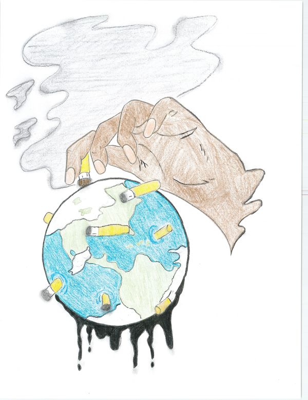 Mackenzie, a 15-year-old student from South Fork High School in Humboldt County, created an artwork addressing the environmental impact of tobacco. Her drawing, made with colored pencils and charcoal, features a powerful visual of the Earth being used as an ashtray, representing how tobacco waste pollutes the planet we all share. The piece emphasizes the urgent need to protect our environment from the harmful effects of tobacco products, reminding viewers that we have only one planet to care for.