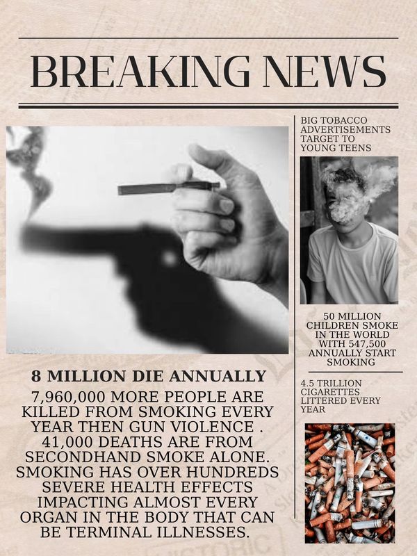 Molly, a 16-year-old student from South Fork High School in Humboldt County, created a powerful digital art piece addressing the topic of Big Tobacco’s manipulation. The work uses striking graphic design to expose the widespread harm caused by the tobacco industry both to individuals and the broader world. With strong visual flow and compelling symbolism such as the depiction of a cigarette as a smoking gun, it captures how tobacco companies continue to deceive the public while causing real damage.