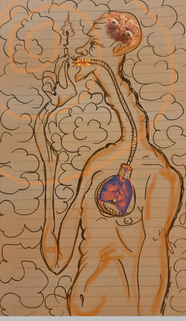 Danika-Lee chose to explore the topic of Big Tobacco’s manipulation through a haunting and emotional art piece. Using sculpture as her medium, she illustrated the deep impact of smoking, not just the physical effects like hair and limb loss, but also the emotional toll, such as detachment and isolation. Her work also touches on the connection between tobacco use and alcohol, creating a layered representation of harm. Through bold symbolism and a raw visual approach, the piece sheds light on the often-overlooked consequences of addiction.