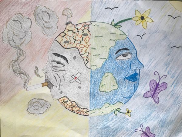 Leila, a student at South Fork High School in Humboldt County, created an art piece that explores the environmental impact of commercial tobacco use. Her work uses a vivid visual contrast to show a planet divided between health and destruction, with one side full of natural beauty and the other littered and polluted. By focusing on the overlooked environmental consequences of tobacco, her piece invites viewers to consider how deeply these products affect the Earth itself. With strong imagery and intentional symbolism, her message is both urgent and thought-provoking.